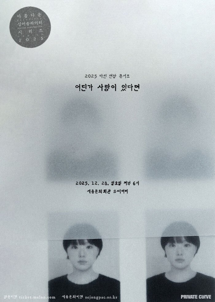 | 공연소개 | 아름다운 싱어송라이터 시리즈 2025 다린 연말 콘서트 <어딘가 사랑이 있다면> 따뜻하고 성숙한 목소리의 싱어송라이터 다린 한 해의 끝자락에서 떠올리는 사랑의 장면을 다린만의 음악으로 풀어낸 연말 단독 콘서트 싱어송라이터 다린은 2017년 EP [가을]로 데뷔해 담담한 목소리와 섬세한 노랫말로 감성을 전하는 아티스트다. 데뷔 당시부터 한 폭의 그림 같은 서정적인 음악으로 깊은 인상을 남겼으며, 두 번째 EP [Stood]에서는 한층 성숙한 사운드와 메시지를 담았다. 이후 [까만 밤], [저 별은 외로움의 얼굴] 등 꾸준한 싱글 발매로 자신만의 음악 세계를 확장했다. 2020년 JTBC <싱어게인>에 ‘56호 가수’로 출연해 본선에 진출하며 대중에게 깊은 울림을 전했고, 이듬해 첫 정규 [숲]을 통해 전곡 작사·작곡·편곡을 직접 맡아 다린만의 감성을 완성했다. 그의 음악은 따뜻하고 깊은 여운을 남기며 많은 리스너들에게 위로를 전해주고 있다. 2022년에는 단독 콘서트 다린 연말 콘서트 <어딘가 사랑이 있다면>의 티켓은 10월 29일 (수) 오후 2시부터 멜론티켓과 세종문화티켓에서 예매할 수 있다. 자세한 내용은 프라이빗커브 공식 홈페이지(www.privatecurve.com)와 소셜미디어(SNS)를 통해 확인할 수 있다. |
