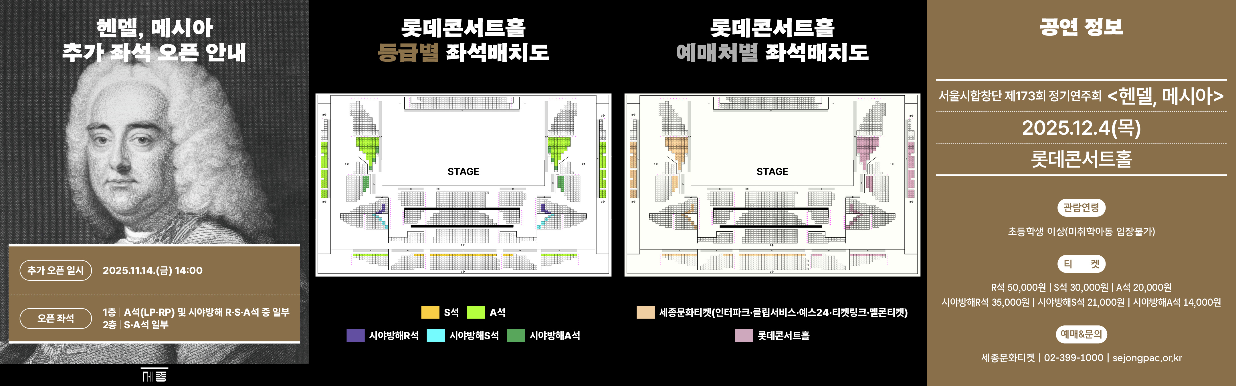 | 공연소개 | 서울시합창단 <헨델, 메시아>가 여러분의 뜨거운 관심과 성원으로 오픈석 전석이 조기 매진되었습니다. - 추가오픈 일시 : 2025.11.14.(금) 오후 2시 - 추가오픈 좌석 : 1층 A석(LP,RP) 일부 / 1층 시야방해 R,S,A석 일부 / 2층 S,A석 일부 * 좌석 작업을 위해 11.14(금) 13:00~13:59까지 모든 예매처의 예매가 일시 중단됩니다. ※ 본 공연은 1인 10매까지 예매가 가능하며, 사전 발권 및 우편배송이 불가합니다. (공연당일 현장수령만 가능) ※ 본 공연은 ‘세종문화티켓(놀유니버스·클립서비스·예스24·티켓링크·멜론티켓)’과 ‘롯데콘서트홀’에 좌석이 배분되어 판매됩니다. ※ 시야방해석은 다른 좌석보다 난간이 높아 시야가 일부 제한되는 좌석입니다. 본 공연에서는 30% 할인가로 판매되며, 추가 할인 또는 공연 당일 시야방해로 인한 취소/환불/변경은 불가합니다. ※ 일반석 중 2층 A, B, C, D, E구역 1열 / 2층 L, R구역은 관객의 안전을 위해 좌석 앞에 안전바가 설치되어 무대 일부를 가릴 수 있는 좌석이니 예매 시 참고를 부탁드립니다. ■ 공연 정보 · 지휘: 데이비드 이 · 합창: 서울시합창단 · 소프라노: 이혜정 · 메조소프라노: 김정미 · 테너: 손지훈 · 바리톤: 이동환 · 연주: 카메라타 안티콰 서울 |