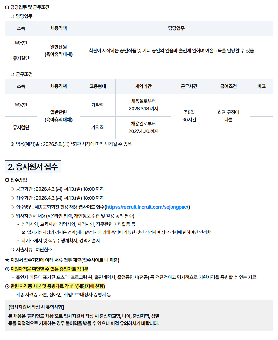 O 접수방법: 세종문화회관 전용 채용 웹사이트 접수(https://recruft.incruit.com/sejongpac/)