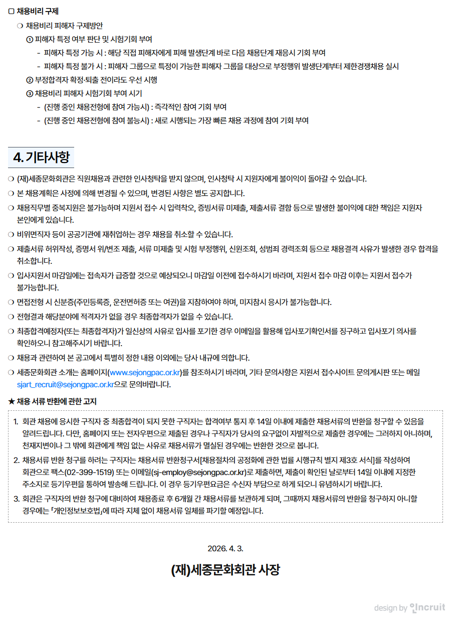 · 채용공고: 회관 및 서울시 홈페이지, 행정안전부 클린아이, 인크루트, 아트모아 등 공고