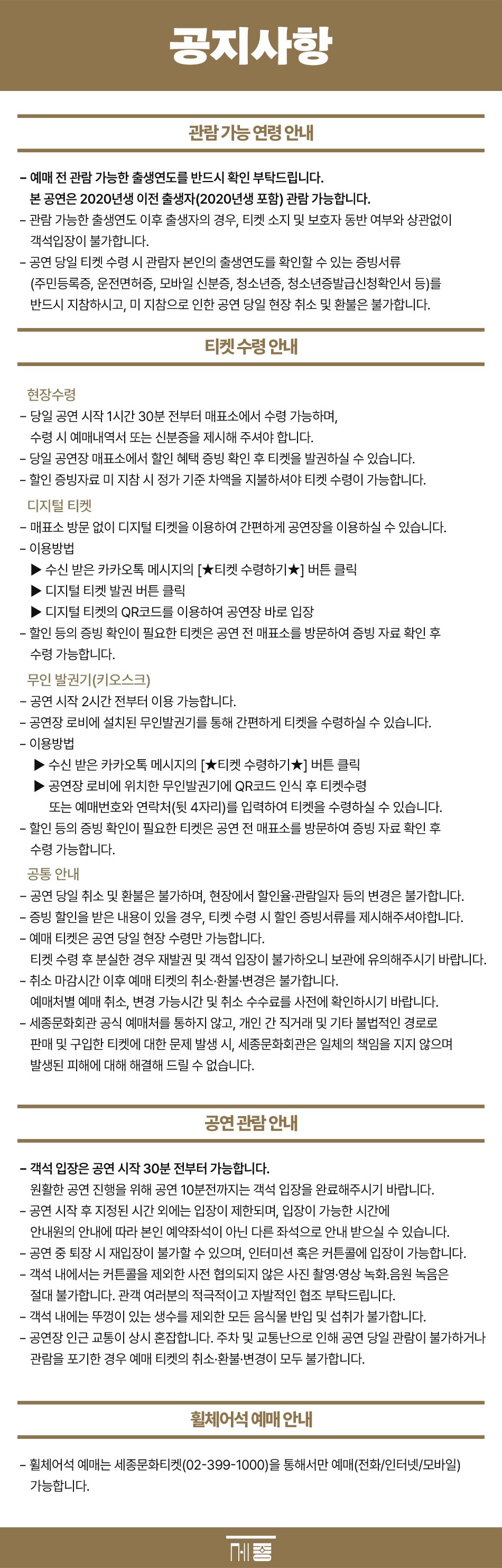 - 공연이 시작된 이후에는 안내원의 유도에 따라서만 입장할 수 있으며, 본인 좌석이 아닌 빈 좌석으로 안내될 수 있습니다.