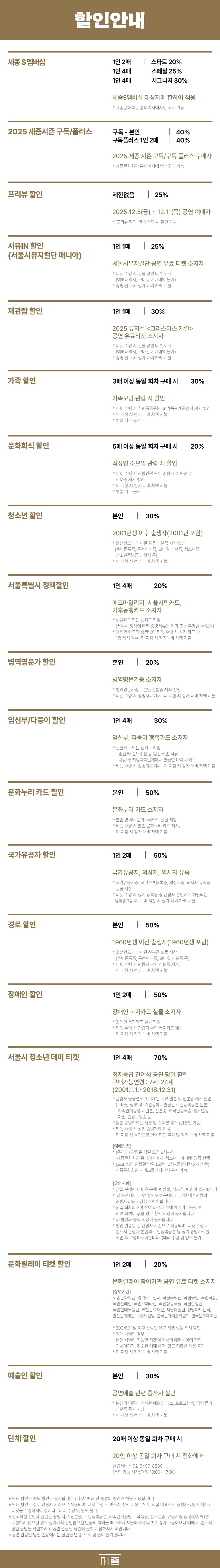공연, 전시(유료), 체험(유료 전시의 체험) 이용 관객은 세종로 공영주차장 이용 시 주차요금 할인을 받을 수 있습니다.