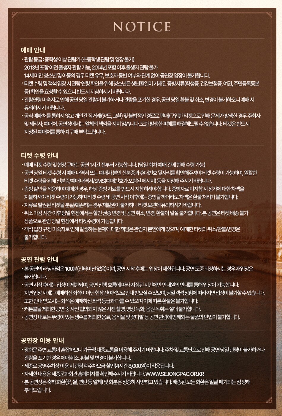- 공연이 시작된 이후에는 안내원의 유도에 따라서만 입장할 수 있으며, 본인 좌석이 아닌 빈 좌석으로 안내될 수 있습니다.