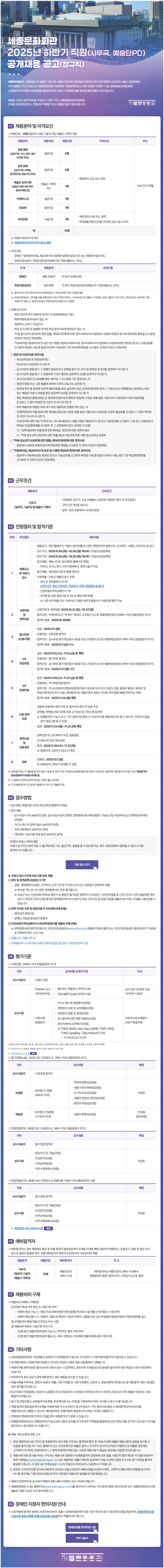 (재)세종문화회관 2025년 하반기 직원(사무국, 예술단PD) 공개채용 공고(정규직)