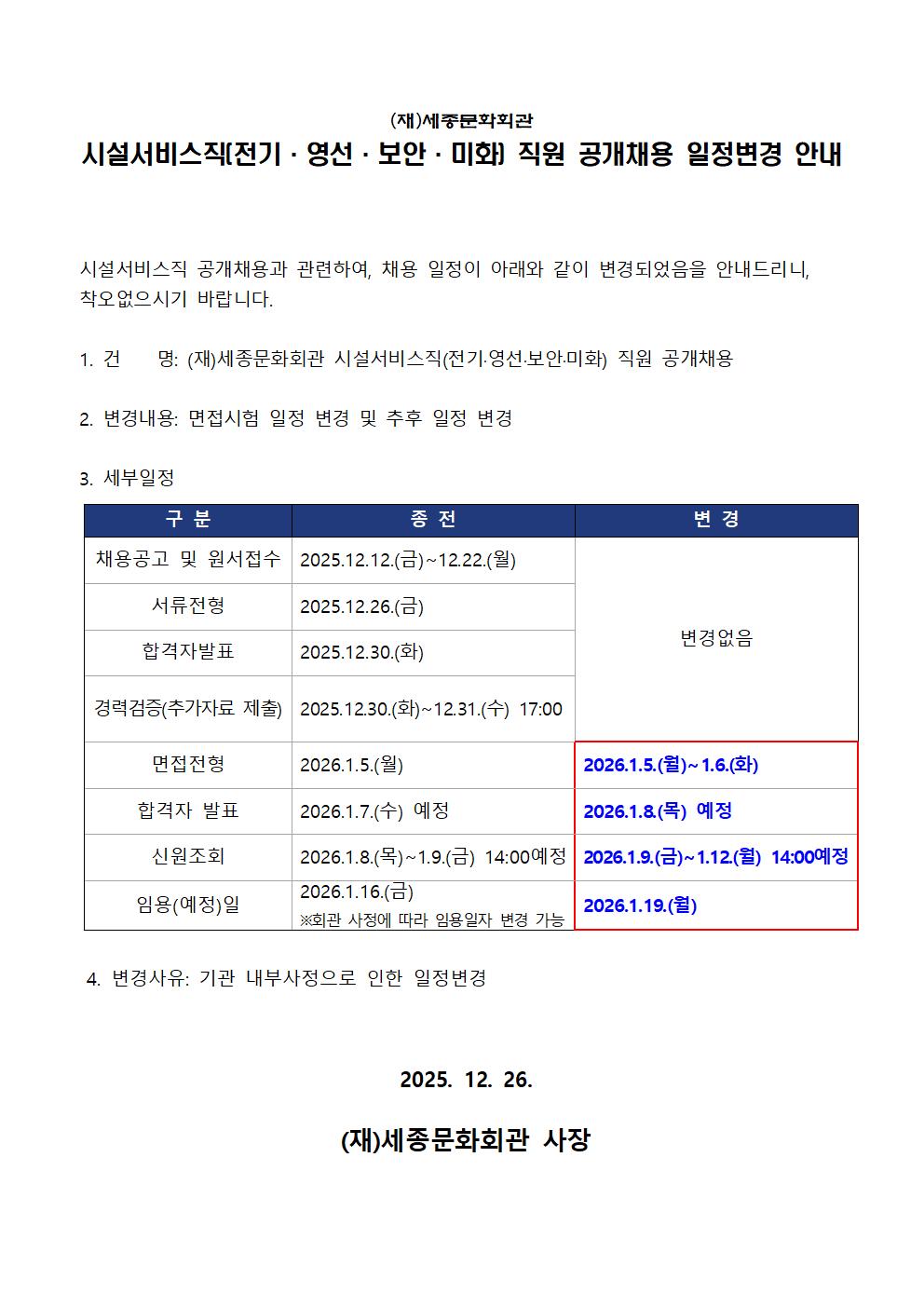 (재)세종문화회관 시설서비스직(전기·영선·보안·미화) 직원 공개채용 일정변경 안내