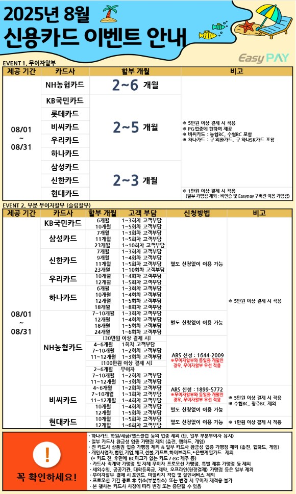 8월 카드사 무이자/부분무이자 할부 이벤트 안내