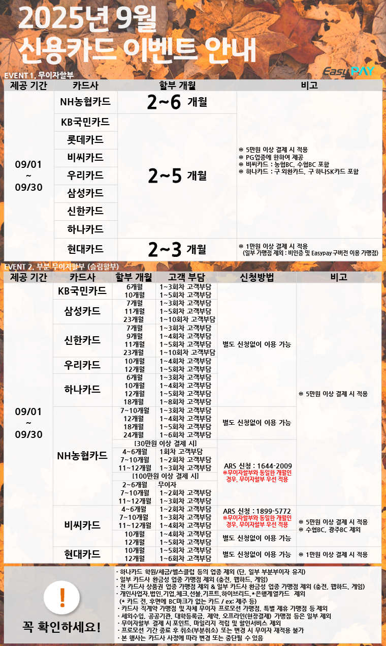 9월 카드사 무이자/부분무이자 할부 이벤트 안내