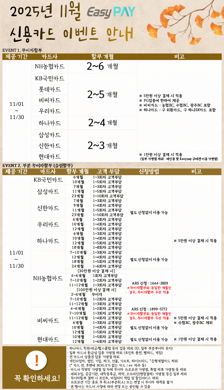 11월 카드사 무이자/부분무이자 할부 이벤트 안내