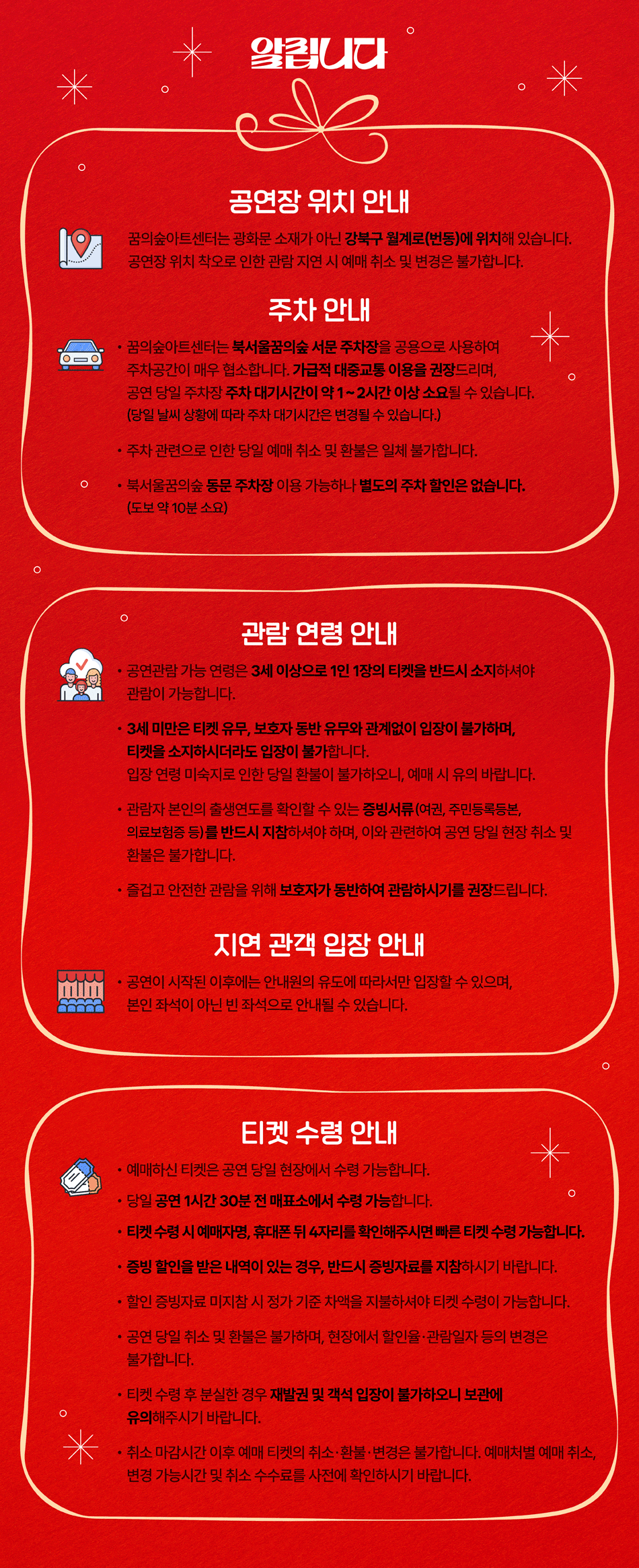 - 공연이 시작된 이후에는 안내원의 유도에 따라서만 입장할 수 있으며, 본인 좌석이 아닌 빈 좌석으로 안내될 수 있습니다.
