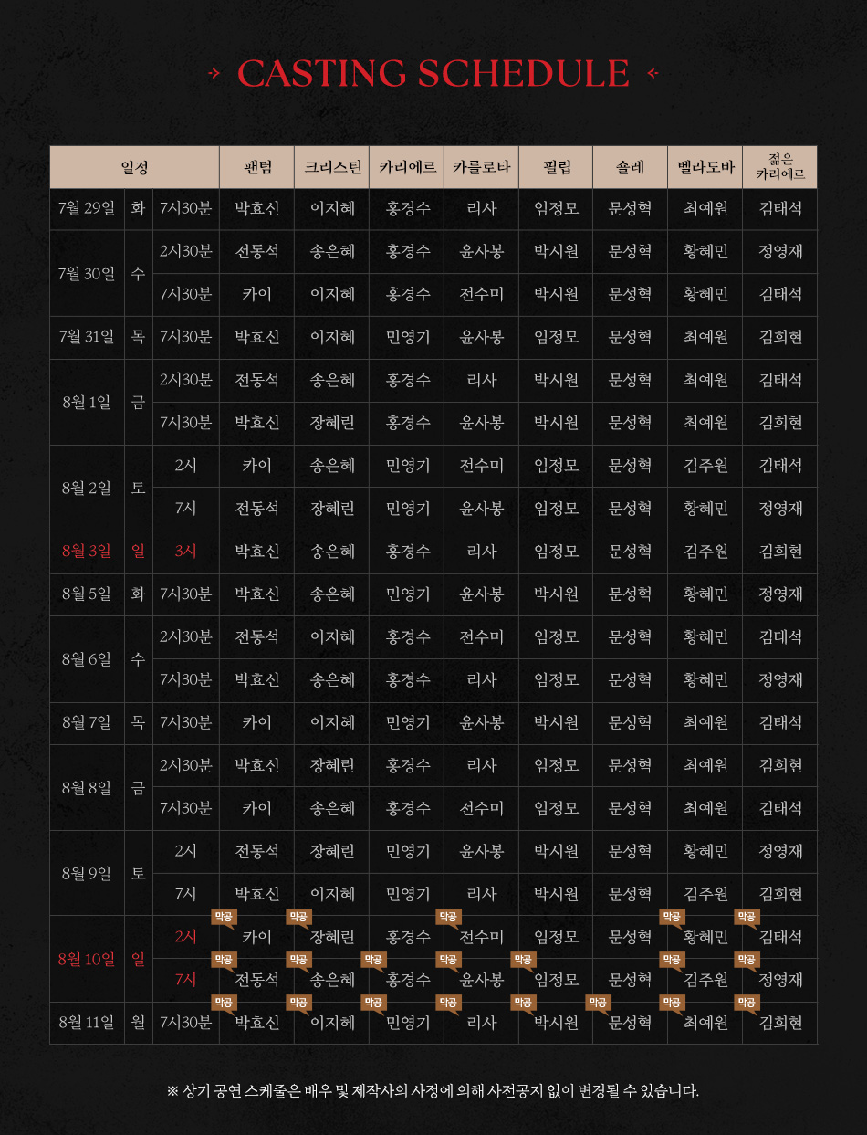 관람 규정 미숙지로 인해 발생하는 책임은 관람자에게 있으며, 이로 인한 입장 티켓의 취소나 환불은 불가하니 반드시 숙지하여 주시기 바랍니다. ※ 일부 회차의 좌석은 사전 판매마감 되었습니다. ※ 7/27(일), 8/10(일) 2시, 7시 / 2회 공연입니다. |