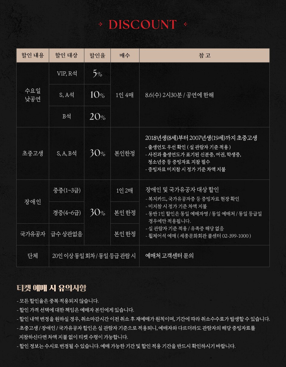 ![NOTICE | 관람 연령 안내 | 1. 본 공연은 8세 이상 관람 가능합니다. (2018년 12월 31일 이전 출생자까지 입장 가능) | 관람 연령 기준은 생년월일을 가장 최우선으로 합니다. | 생년월일 확인이 가능한 증빙자료(건강보험증, 여권, 주민등록증 등)를 반드시 지참하여 확인해 주셔야 합니다. | 미확인 시 티켓 유무, 보호자 동반 여부와 관계없이 입장이 제한되며, 이와 관련한 공연 | 당일 취소 및 환불, 변경은 불가합니다. | 예매 티켓 관련 안내 | 1. 예매 티켓은 관람 당일, 공연 시작 1시간 30분 전부터 매표소에서 수령 가능합니다. | (무인발권기는 공연 시작 2시간 전부터 이용 가능합니다.) | 지류 티켓은 공연 당일 현장 수령만 가능하며 사전 배송이 불가합니다. | 티켓 수령 후 분실할 경우 재발권이 불가하니 보관에 유의하시기 바랍니다. | [디지털 티켓] | ·매표소 방문 없이 디지털 티켓을 이용하여 간편하게 공연장을 이용하실 수 있습니다. | ·이용방법 : 예매 완료 시 수신 받은 카카오톡 메시지의 [★티켓 수령하기★] 버튼 클릭 | ▶ 디지털 티켓의 QR코드를 이용하여 공연장 바로 입장 | [무인발권기] | ·공연장 로비에 설치된 무인 발권기를 통해 간편하게 티켓을 수령하실 수 있습니다. | ·이용방법 : 예매 완료 시 수신 받은 카카오톡 메시지의 [★티켓 수령하기★] 버튼 클릭 | ▶ 공연장 로비에 위치한 무인 발권기에 QR코드 인식 ▶ 티켓 수령 또는 예매번호와 연락처(4자리)를 입력하여 티켓을 수령하실 수 있습니다. | ▶ 무인 발권기는 공연 시작 2시간 전부터 이용 가능합니다. (로비 오픈 : 공연 2시간 전) | 2. 초중고생, 장애인 할인 등 증빙자료 확인이 필요한 티켓은 공연 시작 1시간 30분 전부터 매표소로 방문하여 증빙자료 확인 후 티켓 수령이 가능합니다. | 증빙자료 미지참시 정가 기준 차액을 지불하셔야 합니다. | 3. 취소 마감시간 이후 예매 티켓의 취소 및 환불, 변경은 불가합니다. | 4. 휠체어석은 전화 예매(세종문화회관 02-399-1000)만 가능합니다. | 5. 공식 예매처를 통하지 않고 개인 간 직거래 및 기타 불법적인 경로로 판매 및 구입한 티켓에 대한 문제 발생 시 주최 및 주관사, 제작사와 예매처는 일체의 책임을 지지 않으며 발생된 피해에 대해 해결해 드릴 수 없습니다. | 공연 관람 안내 | 1. 원활한 관람을 위해 가급적 공연 시작 10분 전에는 공연장에 입장해 주시기 바랍니다. | 2. 객석 1층 앞열은 무대, 조명, 배우의 동선 등 공연의 전체적인 모습보다는 무대 가까운 거리에서 배우의 세밀한 표정 연기와 함께 생동감 있는 공연을 즐기고 싶은 관객분들께 추천해 드리는 좌석입니다. 또한, 3층 뒷열로 갈수록 무대의 높이 및 배우의 동선에 따라 일부 장면에서 시야 제한이 발생할 수 있으니 예매 시 유의하시기 바랍니다. | 3. 공연 시작 후에는 지정된 시간 외에는 입장이 불가하며, 다른 관객의 관람에 방해가 되지 않도록 예매 좌석이 아닌 다른 좌석으로 안내될 수 있습니다. 또한, 공연 도중 퇴장 시 재입장이 불가할 수 있습니다. 인터미션 시간에 본인 좌석으로 입장 가능하니, 공연 시작 전 여유 있게 도착하시기 바랍니다. | 4. 캐스팅 일정은 배우 및 제작사의 사정에 따라 사전 공지 없이 변경될 수 있습니다. | 5. 커튼콜을 포함하여 공연 중 사전 협의되지 않은 사진 촬영, 영상 녹화, 음원 녹음은 절대 불가합니다. 공연의 제작사, 공연장, 배우들과 모두 사전 협의한 내용이므로 관객 여러분들의 적극적이고 자발적인 협조를 부탁드립니다. | 공연장 이용 안내 | 1. 주차 및 교통난으로 인해 당일 관람이 불가하거나 관람을 포기한 경우 예매 취소 및 변경이 불가합니다. 세종문화회관은 지하철 5호선 광화문역과 가까우니 대중교통을 이용하시기 바랍니다. | 2. 본 공연은 공연장과 협의하여, 축하 화환 (꽃, 쌀, 연탄 등) 및 화분은 정중히 사양합니다. 공연장으로 배송되는 화환 및 꽃다발 등은 일괄 폐기됨을 양해 부탁드립니다. | ※ 티켓 예매자는 본 안내 페이지의 모든 내용을 확인한 것으로 간주합니다. | 관람 규정 미숙지로 인해 발생하는 책임은 관람자에게 있으며, 이로 인한 입장 티켓의 취소나 환불은 불가하니 반드시 숙지하여 주시기 바랍니다.](/upload/2025/05/20250514_113857173_55637.jpg)