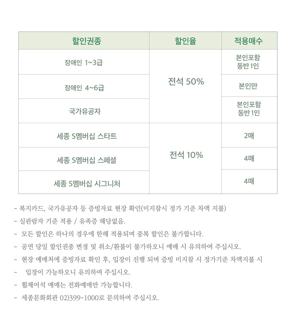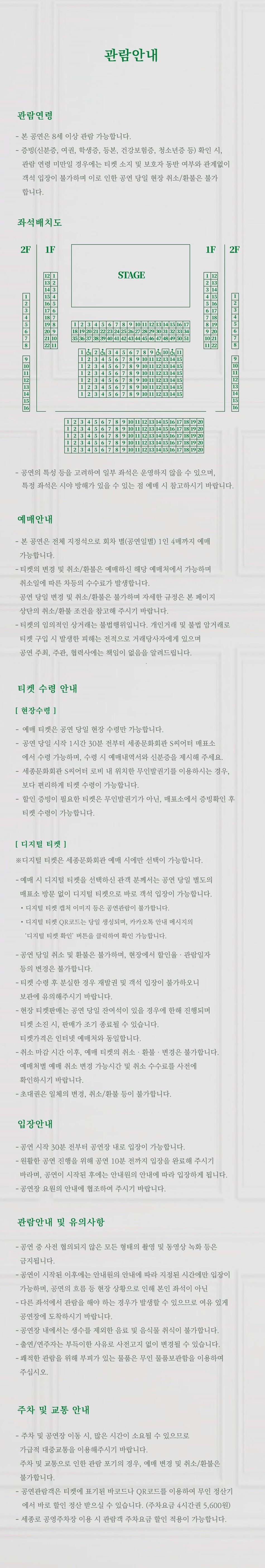 - 공연이 시작된 이후에는 안내원의 유도에 따라서만 입장할 수 있으며, 본인 좌석이 아닌 빈 좌석으로 안내될 수 있습니다.