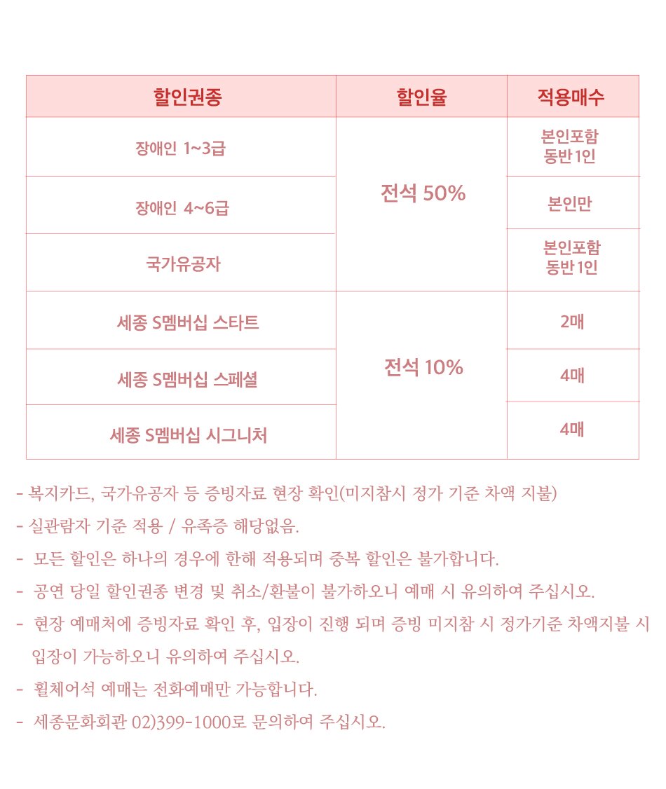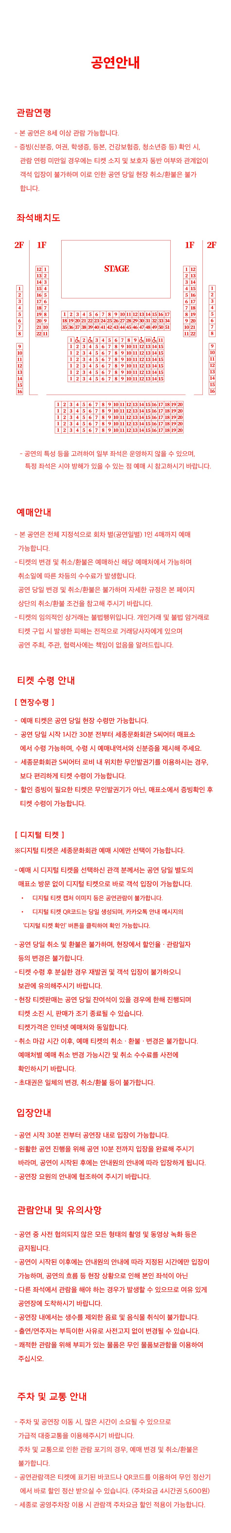 - 공연이 시작된 이후에는 안내원의 유도에 따라서만 입장할 수 있으며, 본인 좌석이 아닌 빈 좌석으로 안내될 수 있습니다.