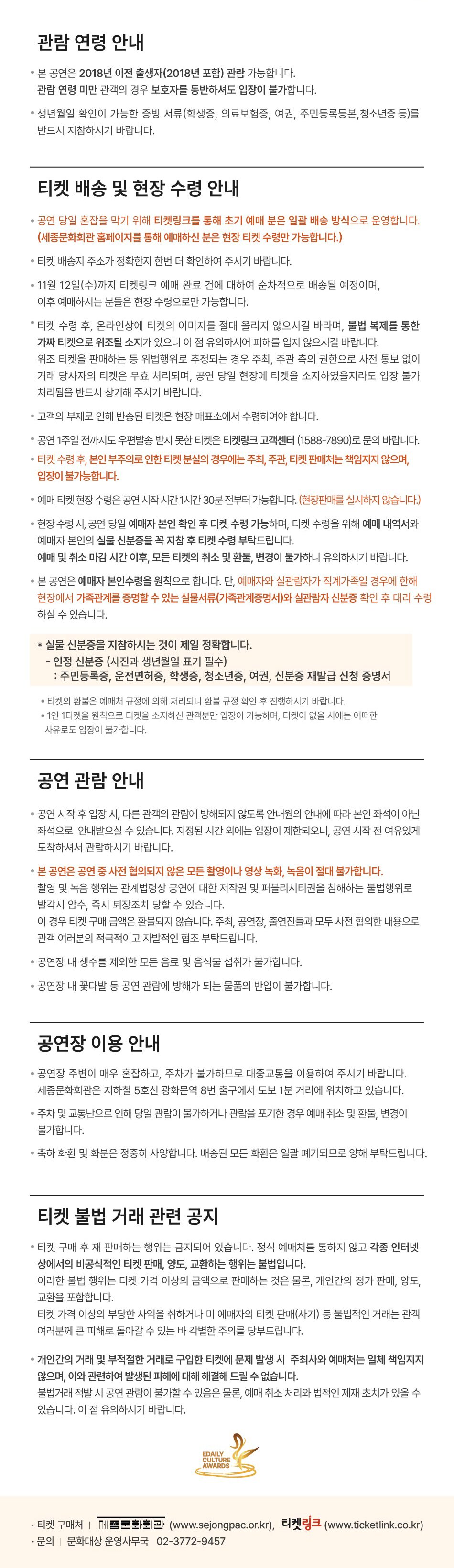- 공연이 시작된 이후에는 안내원의 유도에 따라서만 입장할 수 있으며, 본인 좌석이 아닌 빈 좌석으로 안내될 수 있습니다.