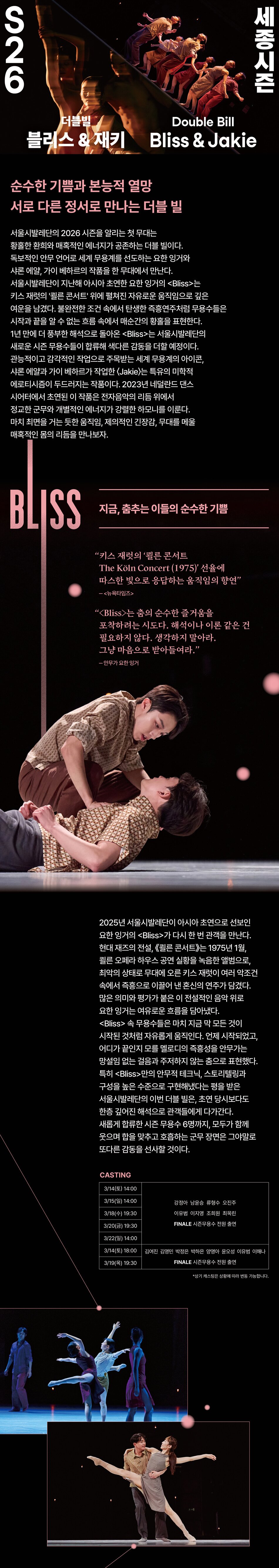 ※ 세종문화회관 홈페이지에서만 구매 가능할인명무용 패키지 예매권(R석) 할인율35% 적용매수1매 증빙서류 및 유의사항2026 세종시즌 무용 패키지 예매권 / R석 한정 할인명세종S멤버십 스타트 할인율20% 적용매수2매 증빙서류 및 유의사항세종ⓢ멤버십 대상자에 한하여 적용 할인명세종S멤버십 스페셜 할인율25% 적용매수4매 증빙서류 및 유의사항세종ⓢ멤버십 대상자에 한하여 적용 할인명세종S멤버십 시그니처 할인율30% 적용매수4매 증빙서류 및 유의사항세종ⓢ멤버십 대상자에 한하여 적용 할인명얼리버드 할인율25% 적용매수4매 증빙서류 및 유의사항26년 1월 6일 ~ 19일 까지 (단, 2주간) 할인명청소년 데이티켓(S석) 할인율70% 적용매수본인 증빙서류 및 유의사항[대상] 2002년1월1일 ~ 2019년12월31일 사이 출생자